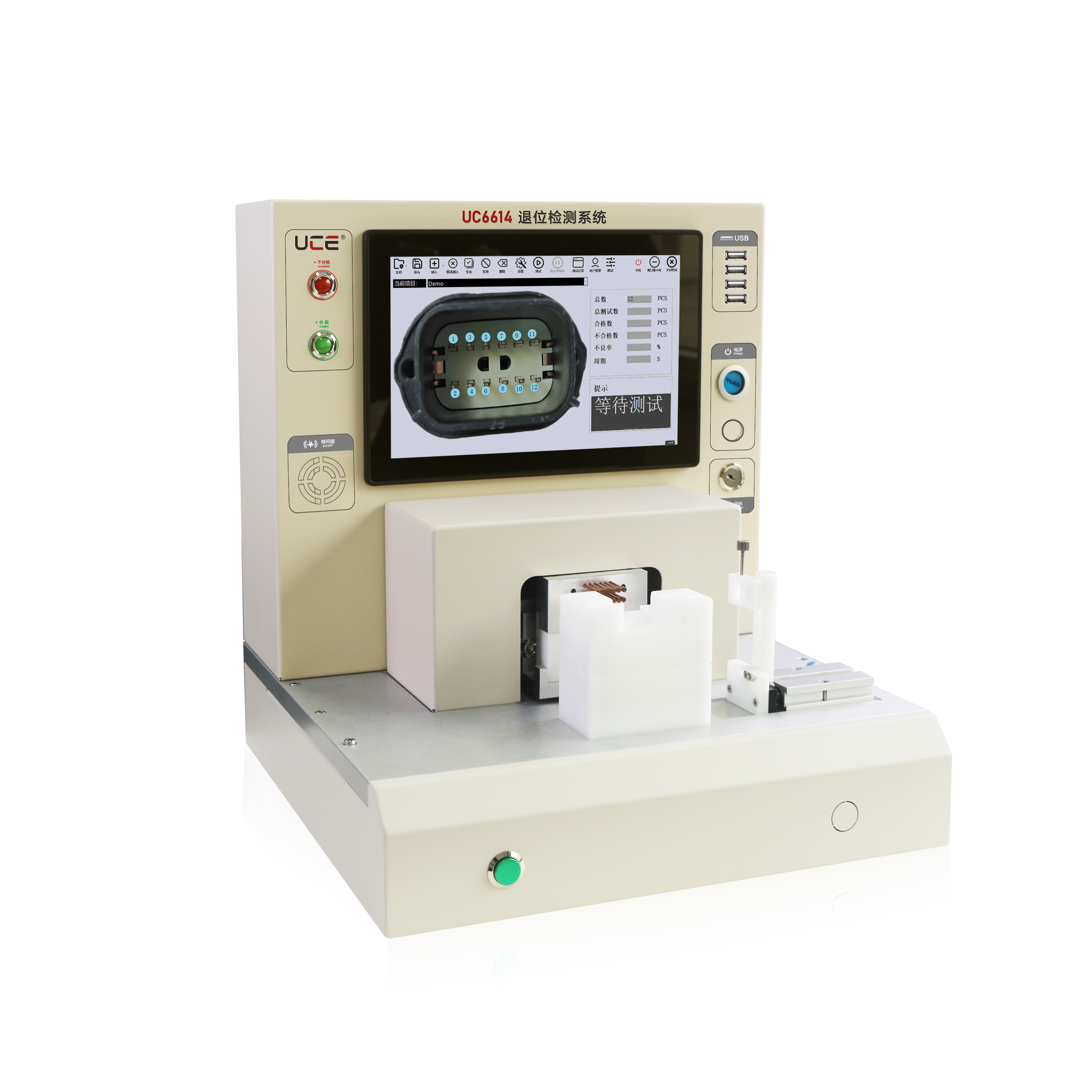 · 高灵敏度位移监测: 检测系统具备0.1毫米级响应精度,有效识别1.5-3mm范围内的端子位移变化,精准捕捉微动退针与安装不到位等隐性缺陷。