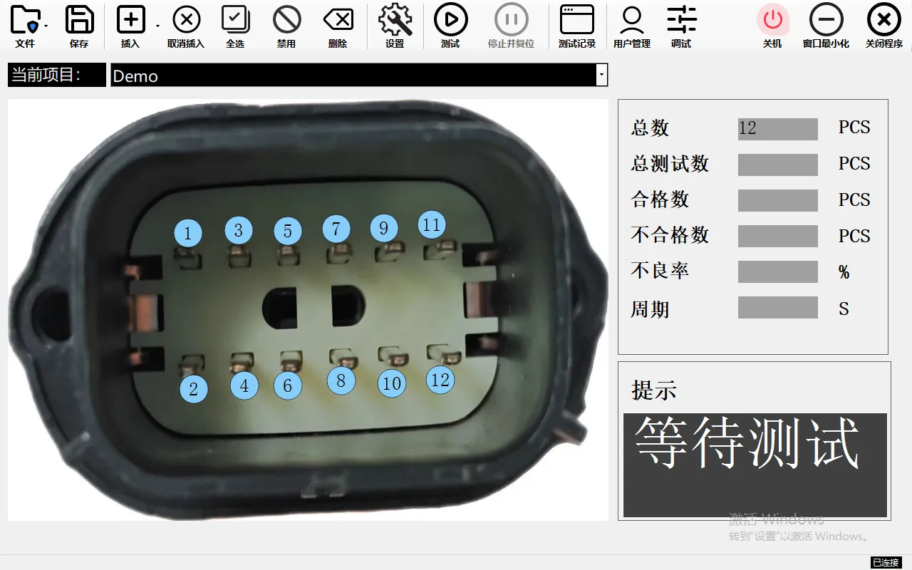 · 数据可视化测试:测试完成后,会立刻在屏幕页面显示当前端子的合格率,不良率,总测试用时等。
